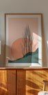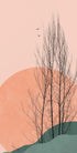 Kojący minimalistyczny krajobraz, Spokój zachodu słońca oddaje ciche piękno natury z uderzającą prostotą. Smukłe, delikatne sylwetki drzew wznoszą się na tle dużego, ciepłego pomarańczowego słońca, otoczone miękkimi, falującymi zielonymi wzgórzami i bladobrzoskwiniowym niebem. Nad nim unoszą się dwa małe ptaszki, dodając poczucia spokoju i otwartości. Zrównoważona kompozycja i stonowana paleta kolorów sprawiają, że ten mebel idealnie pasuje do wnętrz nowoczesnych, skandynawskich lub inspirowanych stylem Japandi i tworzy spokojny punkt centralny w każdym pomieszczeniu.
