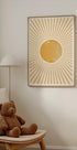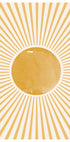 Ta grafika przedstawia minimalistyczny wzór w kształcie słońca z centralnym okręgiem, który promieniuje prostymi liniami, tworząc odważny geometryczny wzór. Zastosowanie ciepłych kolorów nadaje pomieszczeniu charakter retro, vintage, idealny do nowoczesnych wnętrz i artystycznej ekspresji.