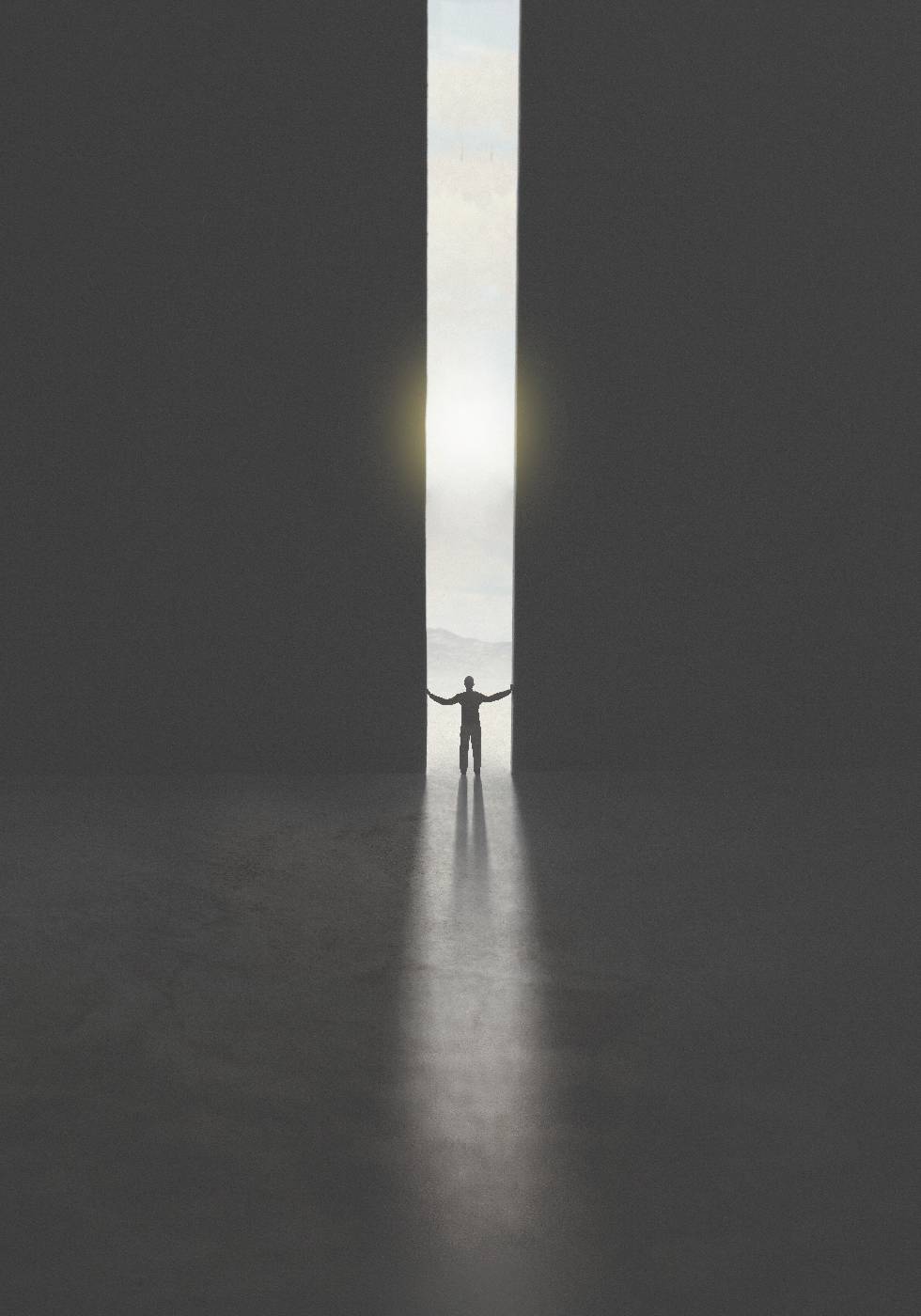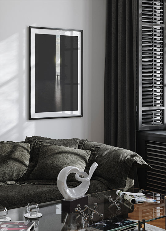 Plakat Out of Darkness* to mocno surrealistyczne dzieło sztuki, które symbolizuje siłę, nadzieję i nowy początek. Samotny człowiek staje przed gigantycznymi drzwiami, odpycha ciemność i wpuszcza światło. Ten minimalistyczny, ale mocny obraz reprezentuje pokonywanie przeszkód, rozwój osobisty i zrobienie kroku w stronę lepszej przyszłości. Idealny do domów, biur, gabinetów terapeutycznych lub jako inspirujący prezent.