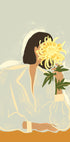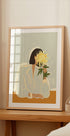 Plakat Golden Flower Tranquility uwiecznia chwilę spokojnej elegancji i kontemplacji. Postać bez twarzy, ubrana w zwiewną, miękką bluzkę, trzyma przed twarzą jaskrawą żółtą chryzantemę, tworząc poetycką grę tożsamości z naturą. Ciepłe musztardowe odcienie blatu i ciemnozielone liście równoważą stonowane pastelowe tło, dzięki czemu złote płatki kwiatów są centralnym punktem. Łącząc nowoczesne linie z teksturowanymi, malarskimi pociągnięciami pędzla, to minimalistyczne, ale wyraziste dzieło idealnie nadaje się do dodania artystycznego spokoju każdemu nowoczesnemu wnętrzu.