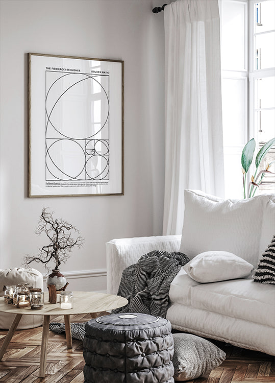 Minimalistyczny plakat matematyczny ilustrujący ciąg Fibonacciego i złoty podział. Ten elegancki projekt ukazuje geometryczne zależności obecne w naturze, sztuce i architekturze. Idealny dla miłośników matematyki, studentów i miłośników nowoczesnego wystroju wnętrz.