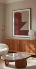 Nowoczesny, minimalistyczny plakat o geometrycznych kształtach w odcieniach głębokiej czerwieni i bordo. Ostre linie i nakładające się powierzchnie tworzą rytm i równowagę, a dyskretne, teksturowane tło zapewnia głębię. Graficzna wypowiedź, która dodaje ciepła, spokoju i wyrazistości salonowi, biuru lub przedpokojowi. Idealny do wystroju nordyckiego.