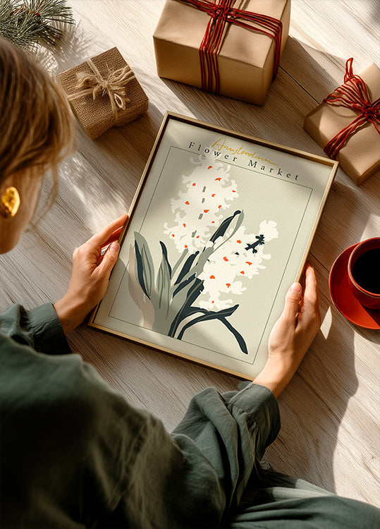 Graficzny hołd dla Amsterdamu: stylizowany hiacynt jest ikoną rynku, otoczony odważną typografią i chłodnymi, nordyckimi odcieniami. Plakat równoważy zimowy spokój z obietnicą wiosny. Zaprojektowane przez Annick i stworzone, aby nadać Twojemu domowi świeży akcent botaniczny z eleganckim, nowoczesnym urokiem. W skandynawskiej tonacji.
