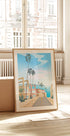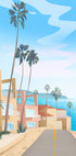 Jasna i kolorowa ilustracja przybrzeżna z palmami, nadmorskimi domami i błyszczącym morzem. Ta grafika oddaje wyluzowany klimat kalifornijskiego lata, idealna do dekoracji ściennych inspirowanych plażą i podróżami.