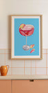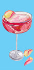 Ta żywa grafika przedstawia stylizowany koktajl w szklance, ozdobiony różowymi i żółtymi płatkami, na jasnoniebieskim tle. Płynne pociągnięcia pędzlem obrazu tworzą nowoczesny i energetyczny wyraz, idealny do motywów związanych z napojami lub sztuką współczesną.