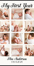 Piękny, spersonalizowany plakat dla dziecka upamiętniający pierwszy rok życia Twojego malucha. Ten wydruk kolażu fotograficznego uwiecznia dwanaście cennych wspomnień, od chwil noworodkowych po pierwsze kamienie milowe. Ponadczasowa pamiątka i idealny prezent dla rodziców, dziadków lub wystrój pokoju dziecięcego.