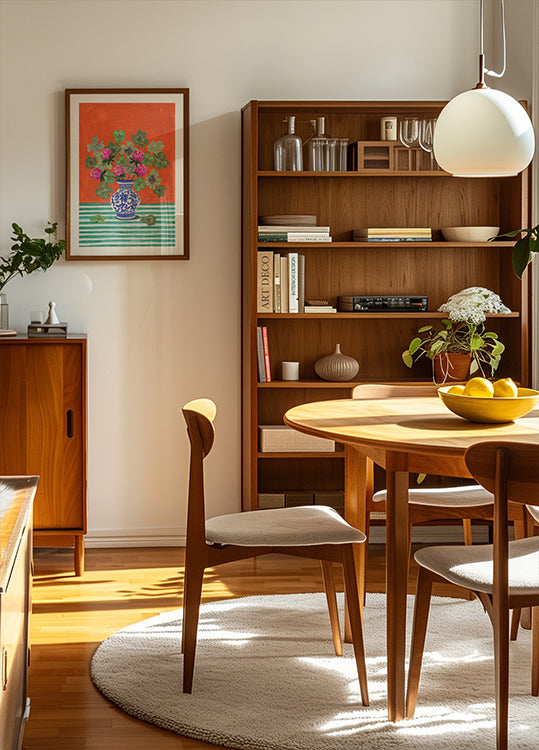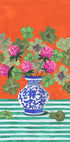 Kolorowa martwa natura przedstawiająca niebieski porcelanowy wazon wypełniony różowymi kwiatami i zielonymi koniczynami, osadzona na mocnym pomarańczowym tle. Obrus w paski zapewnia zabawny kontrast, dzięki czemu ten element stanowi żywy akcent dekoracyjny. Idealny zarówno dla miłośników botaniki, jak i sztuki współczesnej.