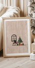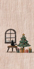 Urocza grafika inspirowana haftem przedstawiająca czarnego kota siedzącego przy oknie i patrzącego na śnieg. Udekorowana choinka prezentami tworzy przytulność i świąteczną atmosferę, idealną jako świąteczna dekoracja domu.