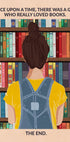 Uroczy plakat ilustracyjny przedstawiający dziewczynkę stojącą przed kolorową półką z książkami i celebrującą swoją miłość do książek. Zabawna typografia brzmi „Dawno, dawno temu żyła sobie dziewczyna, która naprawdę kochała książki. Koniec”. Idealny prezent dla miłośników książek i inspirujący detal dla bibliotek, kącików czytelniczych i przytulnych domów.
