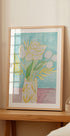 Delikatny pastelowy obraz przedstawiający kwiaty w wazonie, z delikatnymi żółtymi liniami i zielonymi liśćmi na kojącym turkusowym tle. To malownicze dzieło sztuki zapewnia świeżą i lekką atmosferę, idealną do dodania spokojnego, kwiatowego akcentu do każdego pomieszczenia.