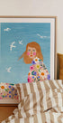 Fantazyjna i kolorowa ilustracja przedstawiająca kobietę owiniętą w kwiecistą pelerynę na tle czystego, błękitnego nieba. Praca otoczona latającymi ptakami przywołuje wolność, radość i świeży duch wiosny. Legendarny, ale i spokojny, łączy w sobie naturę i fantazję w żywym, nowoczesnym stylu.