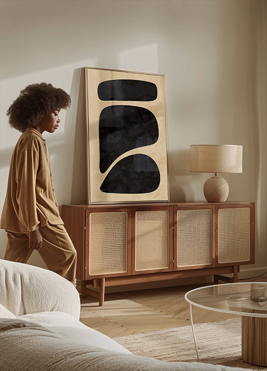 Elegancka abstrakcyjna grafika z trzema efektownymi czarnymi kształtami ułożonymi na ciepłym beżowym tle. Minimalistyczna kompozycja i teksturowana powierzchnia dodają nowoczesnego i wyrafinowanego akcentu – idealnie nadają się do ścian galerii, salonów lub wnętrz inspirowanych stylem skandynawskim.