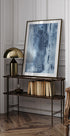 Spokojny, abstrakcyjny motyw w odcieniach głębokiego błękitu, gdzie pionowe, płynne linie tworzą mroźną płynność na obrazie. Monochromatyczna paleta nadaje chłodny, nowoczesny klimat, a miękkie ruchy tworzą równowagę i głębię. Idealnie sprawdzi się w minimalistycznych pomieszczeniach poszukujących stylowego spokoju, lub jako kontrast w ciepłych wnętrzach.