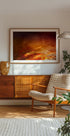 Płonące abstrakcyjne dzieło sztuki, które łączy odcienie czerwieni, pomarańczy i złota, przywołując zarówno przepływ wody, jak i intensywność ognia. Dzięki malarskim zawirowaniom i miękkim fakturom dzieło emanuje ciepłem, pasją i energią – idealnie nadaje się do odważnych wnętrz lub jako dramatyczny element centralny.