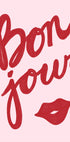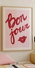 Zabawny i stylowy plakat typograficzny z francuskim słowem Bonjour oraz ilustracja przedstawiająca czerwone usta na delikatnym różowym tle. Idealnie pasuje do nowoczesnych wnętrz, nadaje dekoracji ściennej kobiecą i elegancką atmosferę.