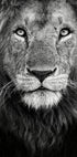 Oszałamiający czarno-biały portret lwa, który podkreśla majestatyczne rysy twarzy i intensywne spojrzenie. To zdjęcie dzikiej przyrody oddaje króla dżungli z uderzającymi szczegółami, ukazując piękno natury i surową siłę królestwa zwierząt.