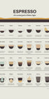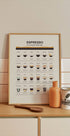Szczegółowy plakat espresso z ilustrowanym przeglądem klasycznych włoskich napojów kawowych. Od espresso i doppio po cappuccino, latte i affogato – ten plakat kuchenny ma zarówno charakter edukacyjny, jak i stylowy. Idealna dekoracja ścienna do kawiarni, kawiarni i domowych kuchni.