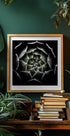 Hipnotyczne zbliżenie rozety Sempervivum, liści rozwijających się w doskonałej symetrii i głębokich zielonych odcieniach na ciemnym, cichym tle. Porządek geometryczny spotyka się z poezją organiczną i tworzy spokojny, graficzny efekt. Fotografia Victora Mozquedy, idealna do nowoczesnych przestrzeni. Kontrast podkreśla architekturę i spokój zakładu.