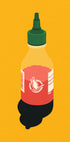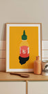 Odważna i nowoczesna ilustracja butelki sosu chili na żywym żółtym tle. Minimalistyczna, ale przyciągająca wzrok – ta grafika graficzna wnosi zabawną energię pop-artu do kuchni, jadalni lub nowoczesnych wnętrz, stanowiąc zabawną propozycję dla entuzjastów jedzenia i designu.