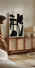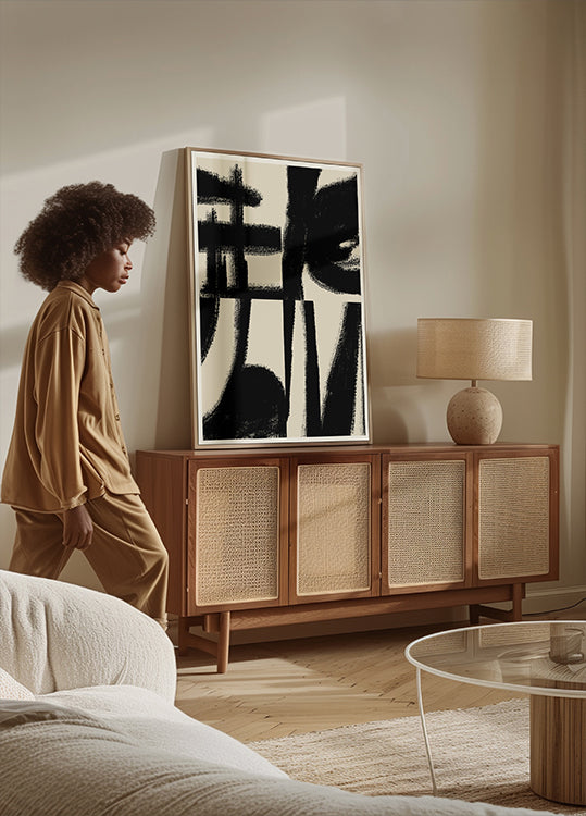 Uderzająca monochromatyczna abstrakcyjna grafika z mocnymi czarnymi pociągnięciami pędzla na neutralnym tle. Teksturowane linie i wyraziste kształty tworzą dynamiczną równowagę pomiędzy ruchem i bezruchem, dzięki czemu jest to nowoczesny akcent we współczesnym wystroju.
