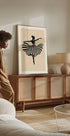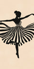 Pełna wdzięku czarna sylwetka baletnicy w środku piruetu, z sukienką w paski płynącą w eleganckim ruchu. Miękkie beżowe tło i mocny kontrast nadają temu elementowi ponadczasowy, stylowy charakter — idealny do dodania artystycznego ruchu do salonu, studia lub ściany z galerią.