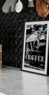 Efektowny czarno-biały plakat z napisem „KAWA” połączony ze zbliżeniem na ekspres nalewający świeżą kawę do filiżanki. Ten minimalistyczny projekt typograficzny, idealny do ścian kuchni, kawiarni lub kawiarni, łączy w sobie inspirację ze stylową monochromatyczną estetyką.