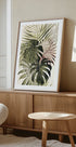 Stylowa kompozycja botaniczna z bujnymi tropikalnymi liśćmi w delikatnych zielonych odcieniach z akcentami różu i złotych detali. Projekt łączy w sobie egzotyczne liście palm i monsterę, tworząc nowoczesny wygląd inspirowany boho, idealny do dodania świeżości i elegancji każdemu wnętrzu.