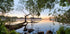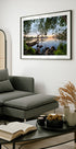 Spokojny nadruk przedstawiający przyrodę, który oddaje ciszę spokojnego jeziora o zachodzie słońca, otoczonego bujną zielenią drzew i gładkich skał wzdłuż brzegu. Lustrzane odbicie nieba i gałęzi tworzy spokojną, marzycielską kompozycję — idealną do dodania poczucia spokoju do sypialni, salonów lub dowolnej przestrzeni inspirowanej naturą.