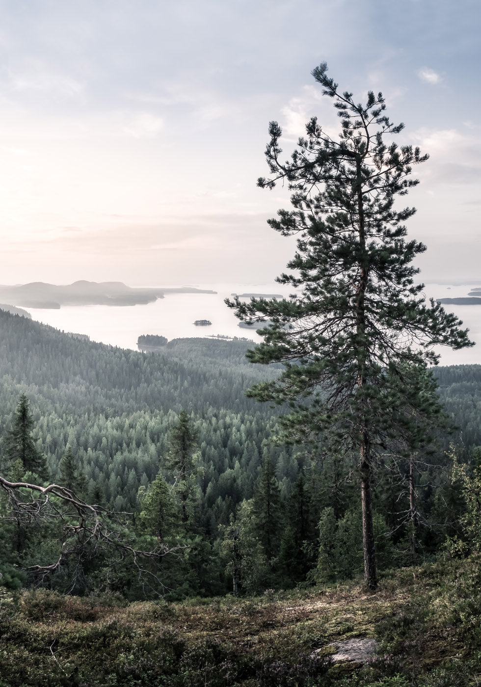 Spokojny krajobraz, który ukazuje piękno nordyckiego lasu z widokiem na duże jezioro. Na pierwszym planie stoi samotna sosna, a niekończące się pasma drzew iglastych nikną w mglistym horyzoncie. Delikatne, pastelowe niebo potęguje spokój i senną atmosferę, dzięki czemu to dzieło sztuki idealnie pasuje do wnętrza inspirowanego naturą.