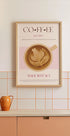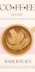 Vintage plakat kawowy z filiżanką latte i misterną grafiką latte podkreślającą świeżo parzoną kawę z palonych ziaren. Projekt skupiający się na włoskim rzemiośle pokazuje kulturę kawy od 1979 roku. Idealny do dekoracji i brandingu kawiarni.