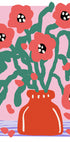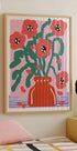Zabawna i minimalistyczna ilustracja przedstawiająca jaskrawoczerwone maki w efektownym pomarańczowym wazonie. Dzięki pastelowemu różowemu tłu i żywym kontrastom kolorów, ta grafika wnosi świeżą, nowoczesną i radosną atmosferę do każdego pomieszczenia.