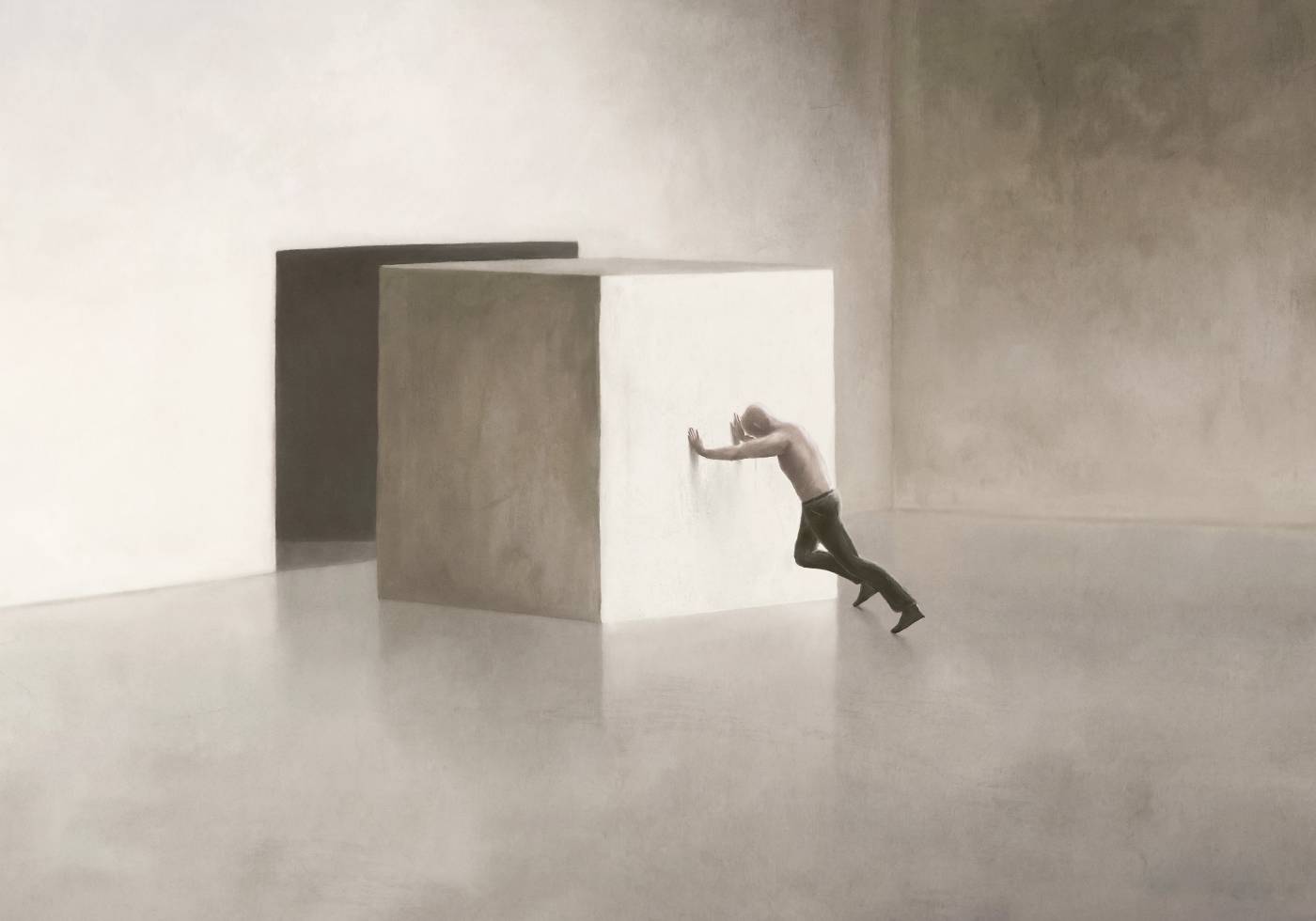 Mocne, minimalistyczne dzieło sztuki przedstawiające samotną postać pchającą gigantyczny sześcian. Ten surrealistyczny obraz symbolizuje walkę, wytrwałość i wyzwania życia. Idealny plakat dla tych, którzy cenią głęboką, skłaniającą do refleksji sztukę o nowoczesnym wyrazie.