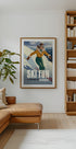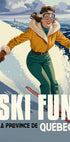 Plakat podróżniczy inspirowany stylem retro autorstwa Andreasa Magnussona: Dynamiczny narciarz w kolorowej kurtce przecina puch na stoku, podczas gdy w tle wznoszą się majestatyczne góry Quebecu i ciemne lasy sosnowe. Wyraźne, graficzne kształty i stonowane kolory w stylu vintage oddają świeży nordycki zimowy nastrój pełen przygód.