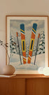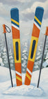Kolorowy motyw zimowy przedstawiający dwie narty wsadzone pionowo w śnieg wraz z dwoma kijkami. Jasne pomarańczowe, niebieskie i żółte kolory wyróżniają się na tle zimnego, białego śniegu. W tle widać ośnieżone drzewa i miękkie, szarawe zimowe niebo, co tworzy sugestywną scenę zimy i radości z jazdy na nartach.