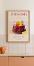 Żywy, inspirowany stylem vintage plakat przedstawiający Sangrię, klasyczny hiszpański poncz przyrządzany z czerwonego wina i świeżych owoców. Dzięki odważnej typografii, cytrusowym detalom i pełnej koloru szklance grafika przywołuje iberyjski urok i ponadczasową kulturę barową – idealna do kuchni, jadalni lub miłośników koktajli.
