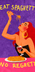 Odważna i zabawna ilustracja czarującej kobiety delektującej się spaghetti i czerwonym winem z humorystycznym zwrotem „Zjedz spaghetti, bez żalu”. Grafika łączy w sobie humor, kobiecość i styl, doskonale sprawdzi się jako wyrazisty akcent w kuchni, jadalni lub jako nowoczesna dekoracja ścienna.