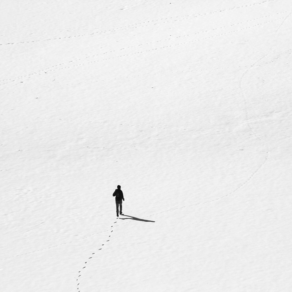 Poetyckie, czarno-białe zdjęcie lotnicze śnieżnego krajobrazu, na którym białą ciszę przecina pojedyncza osoba i jej ślady. Długie cienie i wysoki kontrast tworzą minimalistyczny spokój i poczucie zanurzenia. Ponadczasowa zimowa kompozycja autorstwa MOSTAFA NODEH. Motyw równoważy ciszę i emocje w graficznej, śnieżnej przestrzeni.