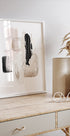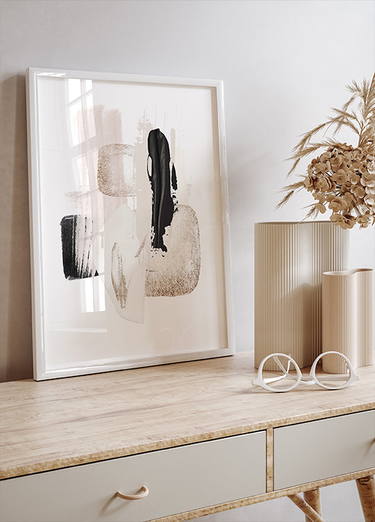 Stylowy abstrakcyjny plakat z teksturowanymi pociągnięciami pędzla w kolorach czarnym, beżowym i złotym. Nowoczesna kompozycja łączy w sobie malarską fakturę z minimalistyczną elegancją, idealna dla nowoczesnych wnętrz i miłośników sztuki.