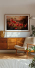 - Zamontowany na drewnianej ramie o grubości ok. 4 cm