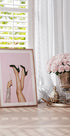 Odważny i stylowy plakat emanujący imprezową atmosferą z eleganckimi nogami w czarnych szpilkach i musującym kieliszkiem szampana na pastelowym różowym tle. Połączenie mody, świętowania i blasku dyskoteki sprawia, że jest to idealny plakat do nowoczesnych wnętrz.