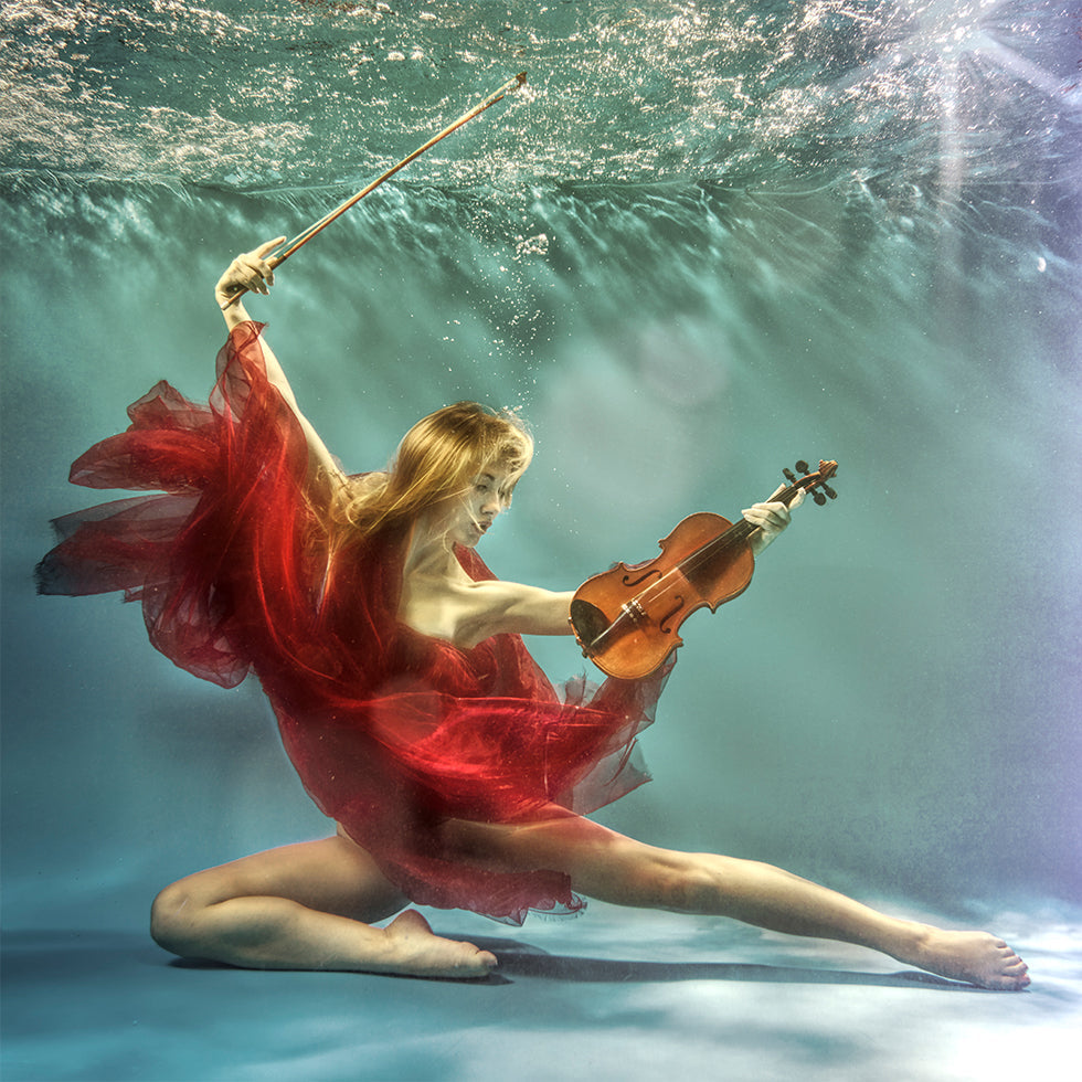 Senny podwodny portret, na którym para pływa w basenie i gra na skrzypcach wśród świetlistych bąbelków i kołysających się kwiatów. Romans i muzyka łączą się w cichym preludium, które emanuje poezją, pasją i nieważką elegancją. Fotografia autorstwa Uniquecapture, stworzona, aby wywoływać emocje. Idealny jako centralny element przyciągający wzrok w domu.