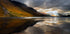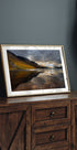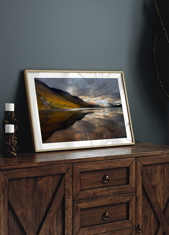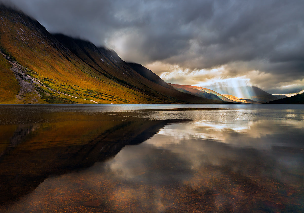 Oszałamiający plakat krajobrazowy z Glencoe w Szkocji, gdzie otwierają się dramatyczne chmury, a promienie słońca padają nad wyżynami i jeziorem. Spokojna woda odzwierciedla surowe góry i tworzy potężną, ale spokojną kompozycję, która oddaje harmonię i ciszę natury.