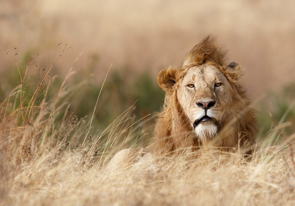Władczy i spokojny samiec lwa stoi w smaganej wiatrem trawie sawanny, a jego grzywa faluje jak płomień, gdy miękki bokeh topi Serengeti w złoto. Każdy wąs i bursztynowe spojrzenie wyrażają cichą władzę dziczy. Ten portret, wykonany w Tanzanii przez fotografa Alego Khatawa, ukoronuje każdą przestrzeń nieposkromionym majestatem.