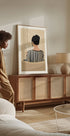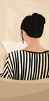 Ciepła i zachęcająca ilustracja przedstawiająca kobietę czytającą od tyłu, ubraną w pasiasty top. Miękkie beżowe odcienie i zrelaksowany nastrój tworzą kojącą estetykę, dzięki czemu jest to idealny element do sypialni, salonów lub kącików do czytania — idealny dla każdego, kto kocha spokojne chwile i przytulne przestrzenie.