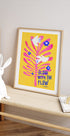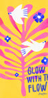 Wesoły i motywujący plakat z dwoma białymi gołębiami lecącymi wśród mocno różowych liści i niebieskich kwiatów na żywym żółtym tle. Zabawna typografia „Glow with the Flow” dodaje podnoszącego na duchu przesłania pozytywnego i radości. Idealny do wprowadzenia dobrej atmosfery do każdego pomieszczenia.