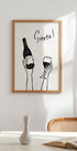 Ręce trzymające butelkę wina i kieliszek do wina z tekstem „Na zdrowie!” w plakacie francuskim