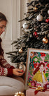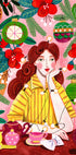 Ciepła scena bożonarodzeniowa w stylu retro: uśmiechnięta rudowłosa kobieta w pasiastej bluzce pije parującą herbatę obok błyszczącej choinki wypełnionej bombkami i girlandami. W oknie błyszczy śnieg, kolory różu i sosnowej zieleni wywołują nostalgię. Przytulna ilustracja inspirowana stylem połowy XX wieku autorstwa Caroline Bonne Müller. Idealny do zimowych zabaw.
