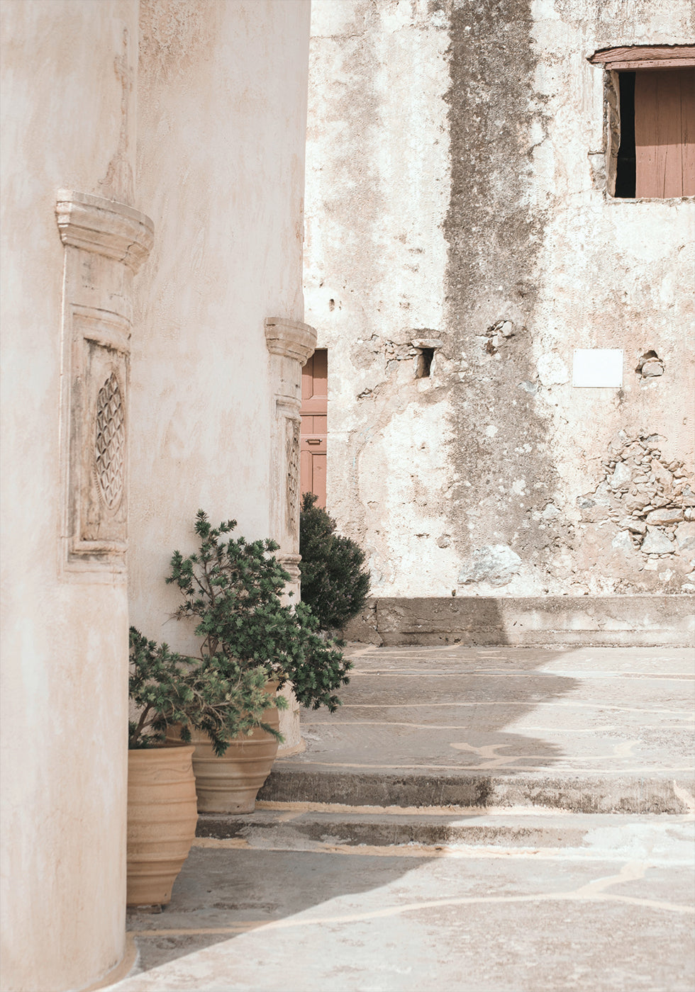 Spokojny motyw rustykalnego zakątka śródziemnomorskiej ulicy ze starymi ścianami, roślinami doniczkowymi i delikatnym światłem słonecznym. To dzieło sztuki oddaje ponadczasowy urok śródziemnomorskiej architektury i piękno prostoty, idealne do stworzenia relaksującej atmosfery.
