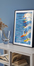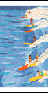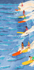 Żywa i kolorowa ilustracja przedstawiająca surferów jeżdżących na falach na longboardach, ukazujących beztroską energię lata i morskiego życia. Dzięki mocnym kolorom i dynamicznemu ruchowi ten element celebruje sporty wodne, podróże i wypoczynek i idealnie pasuje do wnętrz inspirowanych morzem lub surfingu w stylu retro.