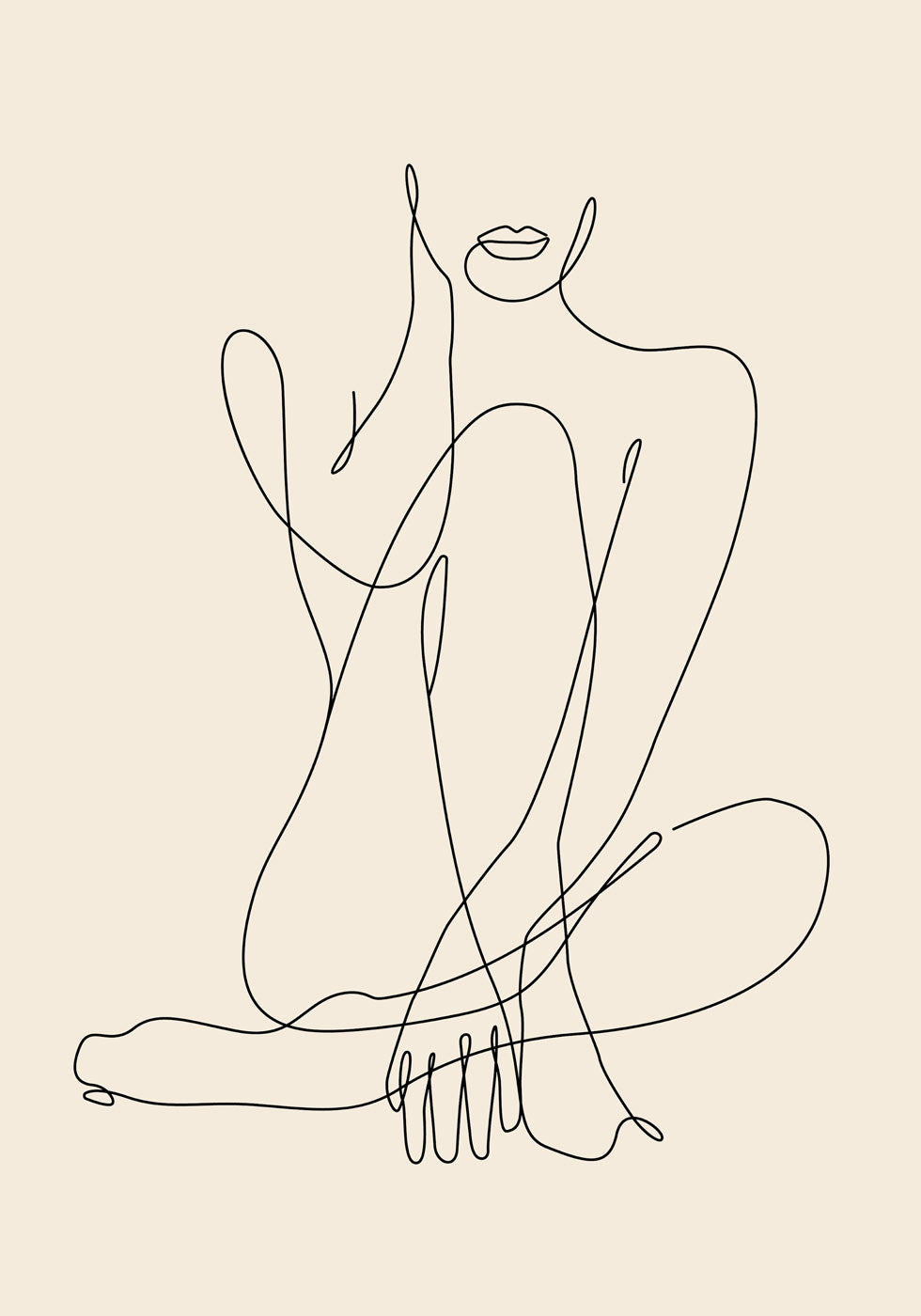 Elegancki i artystyczny rysunek przedstawiający siedzącą kobietę, wykonany jedną kreską, wyrażający kobiece piękno i minimalistyczny styl. Proste, a zarazem wyraziste linie tworzą nowoczesny i wyrafinowany wygląd, idealny do nowoczesnych i skandynawskich wnętrz.